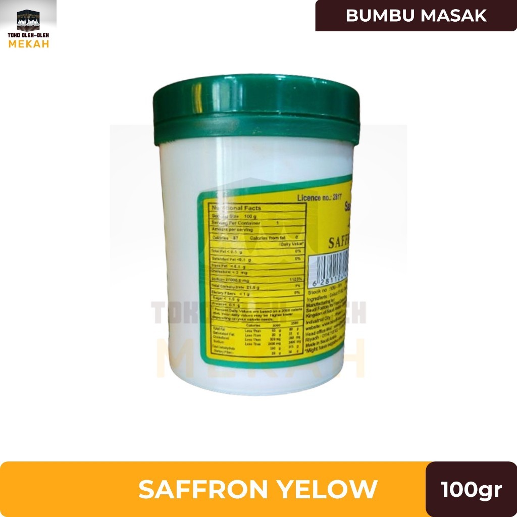 Saffron bubuk warna kuning 100gr untuk pewarna makanan alami, biasanya untuk Biryani dll. Produk original dari Saudi Factory for Food Colours & Improvers.