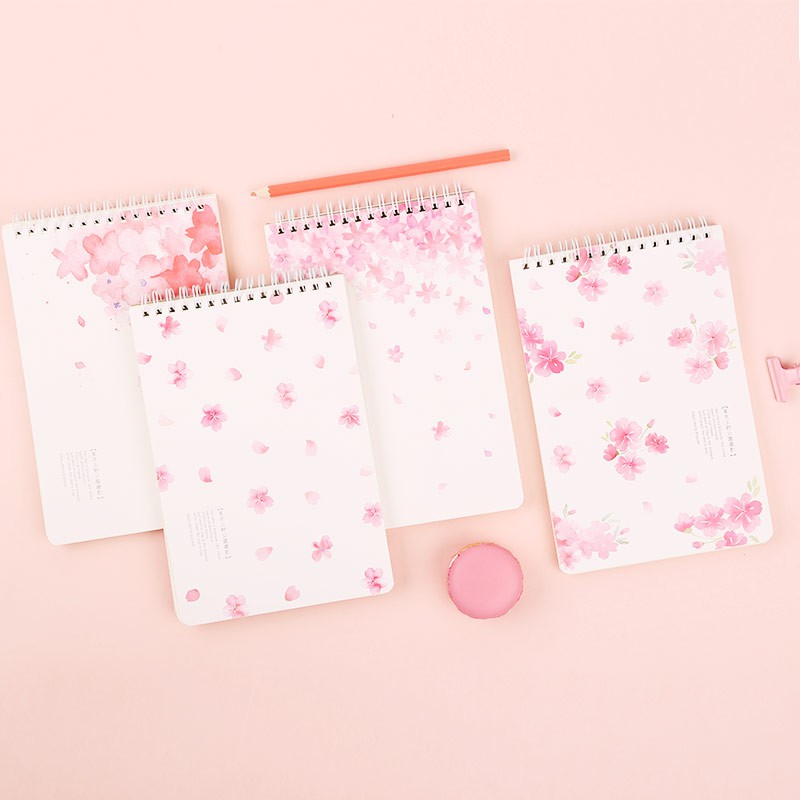 Buku notes seri Sakura Flower memiliki sampul bertema desain bunga-bunga Sakura di musim semi. Di dalamnya terdapat halaman bergaris yang cocok untuk kebutuhan sehari-hari, yang mana setiap lembarnya dijilid spiral sehingga tidak mudah tersobek.