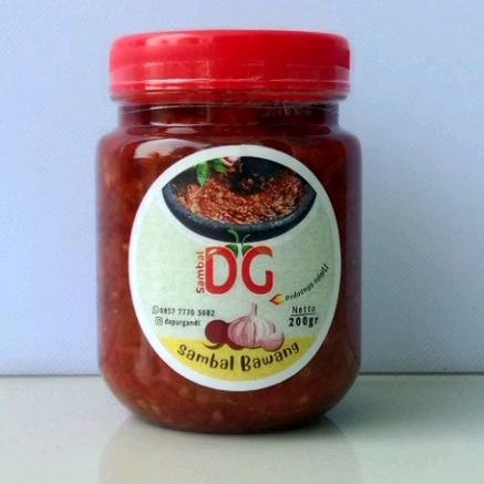 Sambal Bawang DG merupakan sambal home made DEGA. terbuat dari cabe rawit, tomat, bawang merah, bawang putih dan bahan pilihan sehingga tercipta rasa pedas yang ngigit dan pas di lidah. sambal DG tanpa bahan pengawet sehingga aman di konsumsi.