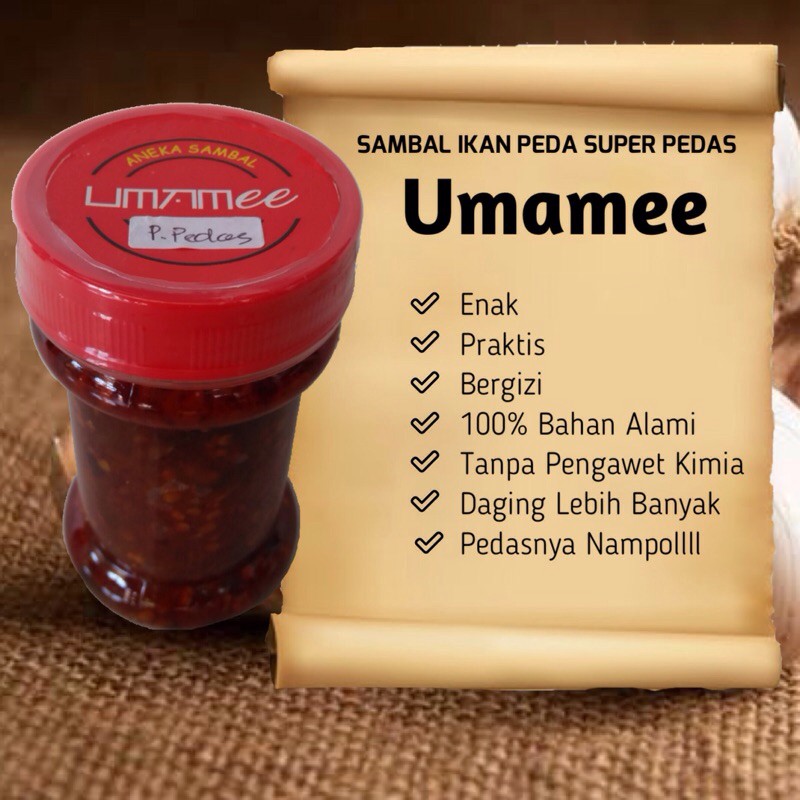 Sambal Umamee kemasan 130gr adalah sambal yang praktis untuk makan sehari-hari dan mengandung banyak gizi serta vitamin yang terdapat di dalam bahan-bahannya.
