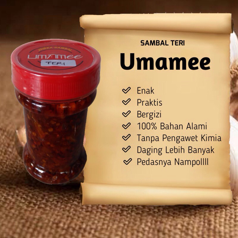 Sambal Umamee kemasan 130gr adalah sambal yang praktis untuk makan sehari-hari dan mengandung banyak gizi serta vitamin yang terdapat di dalam bahan-bahannya.