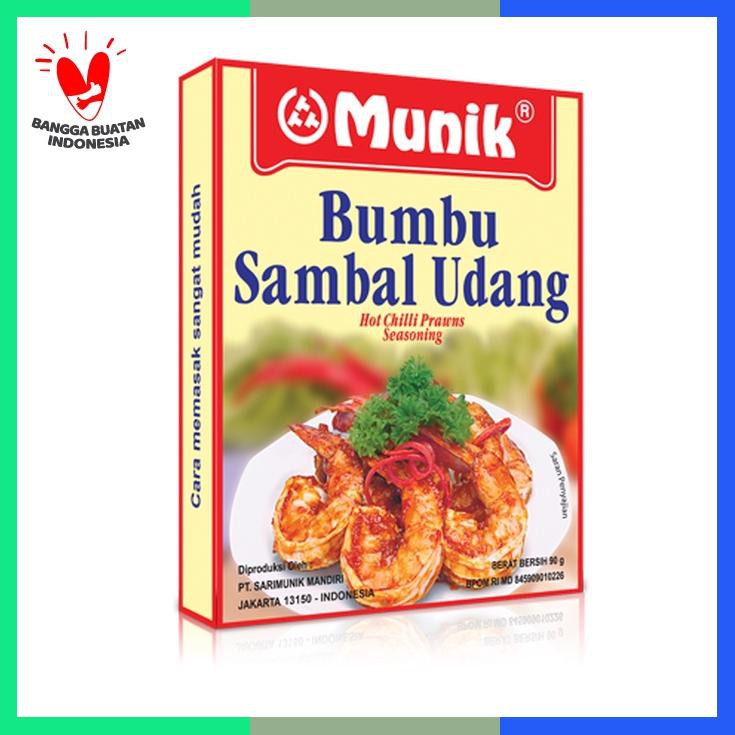 Mudah dan Nikmat ( MUNIK), semua bumbu masak Munik terbuat dari bahan- bahan rempah alami dan diolah secara higienis untuk pemakaian terbaik Anda. Bumbu Munik Sambal Udang juga praktis, halal dan cocok digunakan siapa saja karena telah tersedia petunjuk di kemasan untuk resep sukses keluarga.