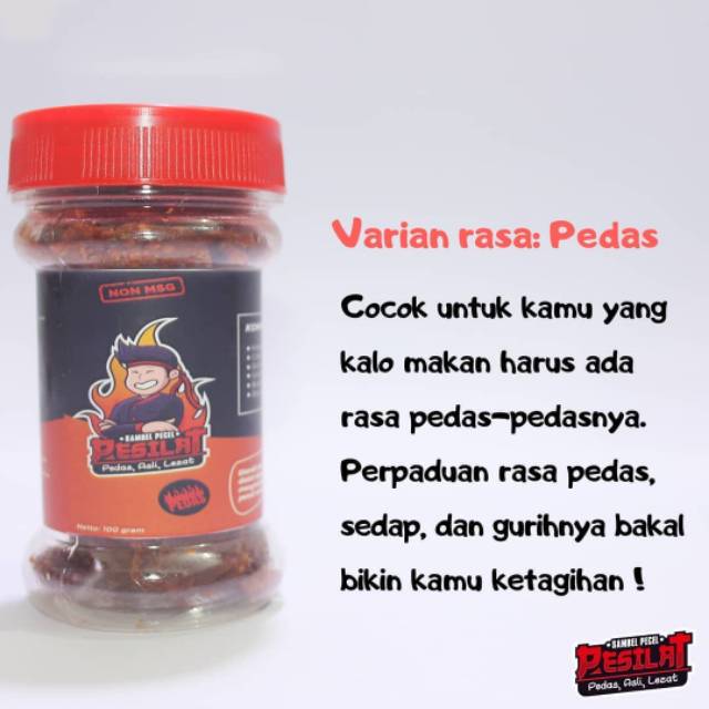 Sambel Pecel Pesilat merupakan Produk Asli Madiun dan sudah terkenal dengan kenikmatannya. Sambel Pecel Pesilat Rasa Pedas cocok banget buat kamu pecinta pedas. Rasa pedasnya nikmat, sedap, dan bikin kamu ketagihan. Produk ini dibuat tanpa Bahan Pengawet dan Tanpa MSG. Diolah dari bahan-bahan yang kualitasnya terbaik dan segar membuat produk ini banyak disukai orang dan juga halal. Kemasan yang digunakan dipacking dengan rapi dan aman. Kemasannya menjamin kebersihan dan higienis sehingga menjaga sambel didalamnya tetap bersih dan nikmat. Praktis dan mudah dibawa kemana saja.