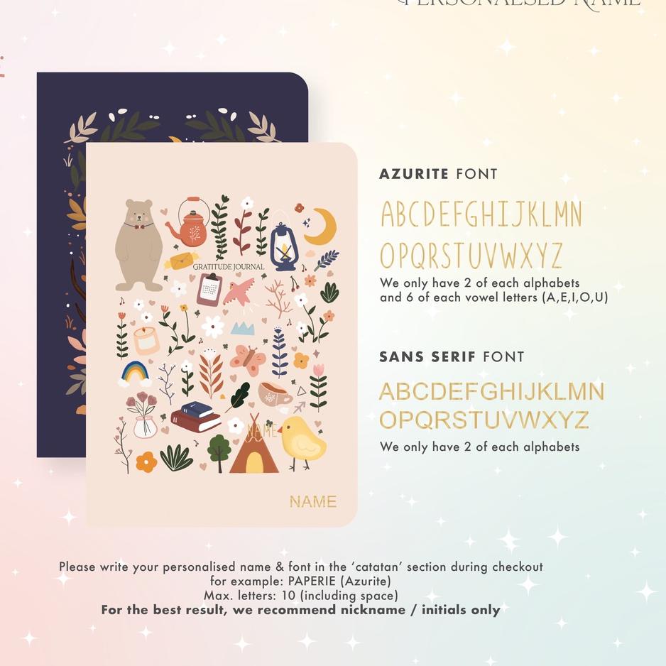 BUDAYAKAN MEMBACA SEBELUM MELAKUKAN PEMBELIAN Paperie Lab - Gratitude Journal Our Gratitude Journal enables you to record things that you personally appreciate or are thankful for in your daily life. If you stop for just a few minutes of each day writing down your gratitude list and appreciate having certain things in your life, you’ll learn to treasure things more when you encounter them. This keeps your focus on the positive aspects of your life and puts you on the road to being a happier person! Includes: - daily gratitude - weekly reflection - gratitude challenge - Interactive pages - Brain dump / Dream Journal All books will be crafted with monogram lettering with silver or rose gold foil, hard-covered, finished with perfected bounded (sewn) *Don‘t forget to custom your name on “notes to seller” section, otherwise, we will proceed your order using recipient name *maximum alphabet for monogram: 10 characters. - Fast respon jam kerja Senin - Jumat pukul 9.00 - 17.00, Sabtu pukul 9.00 - 14.00, Minggu atau hari libur Off - Mohon mencantumkan warna/gambar/varian pilihan dan cadangannya (jika ada) di kolom pemesanan ya. Jika tidak mencantumkan pilihan, maka akan kami kirimkan sesuai stok yang ready!!! - Pengiriman pada H+1 (malamnya). - Jika barang yang di pesan kosong dan tidak ada respon selama 1x24 jam maka akan di kirim secara random. - Periksa kembali NOMOR HP (TELP) & ALAMAT LENGKAP. Guna mempercepat dan memperlancar pengiriman. - BARANG YANG SUDAH DI BELI TIDAK BISA DI KEMBALIKAN. - Gudang kita ada di DKI Jakarta, Jawa Timur, Jawa Tengah, Jawa Barat dan lainnya. Jadi pengiriman tidak selalu sesuai alamat toko ini yaaa.. >>>> MEMBELI = SETUJU