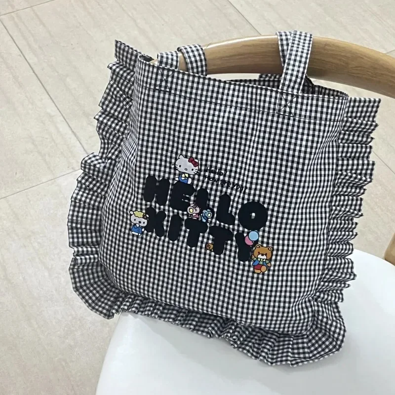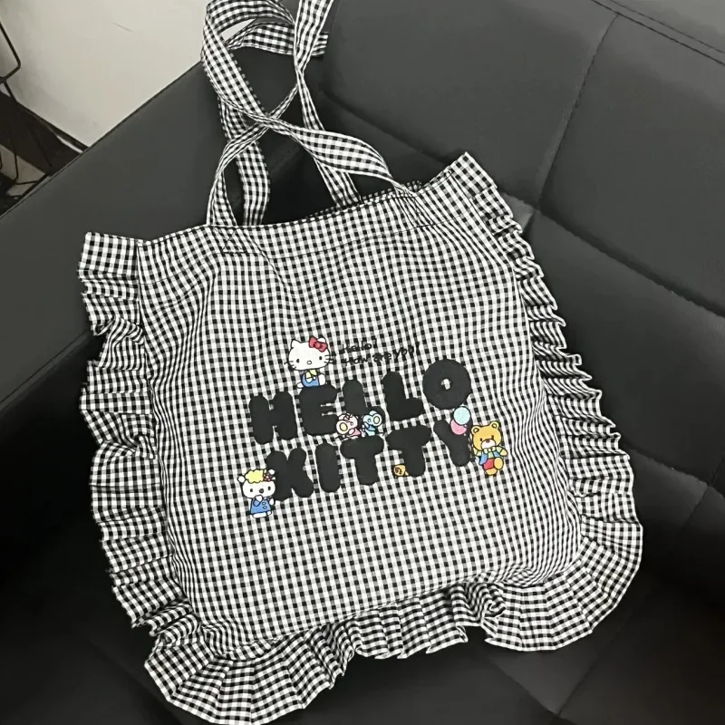 Sanrios HelloKittys черно-белая клетчатая гофрированная аниме кавайная девочка мультяшная сумка на плечо для поездок ручной парус тканевая сумка подарок