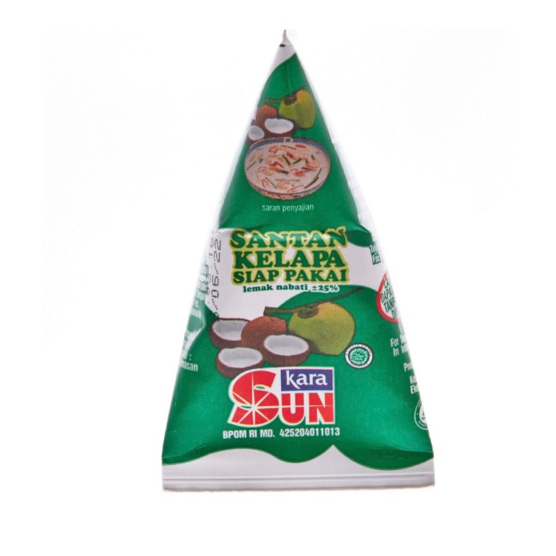Kara Sun Santan TCA 65 ml merupakan santan kelapa siap pakai yang terbuat dari air kelapa yang dikukur. Santan Kara Sun diolah dan dikemas secara modern dan higienis menggunakan sterilisasi tinggi (UHT) sehingga kesegaran dan keaslian santan terjaga dengan baik, serta membuatnya tahan disimpan dalam waktu lama di dalam kulkas. Mengandung lemak nabati kurang lebih 25%, juga dibuat tanpa pengawet sehingga aman digunakan.