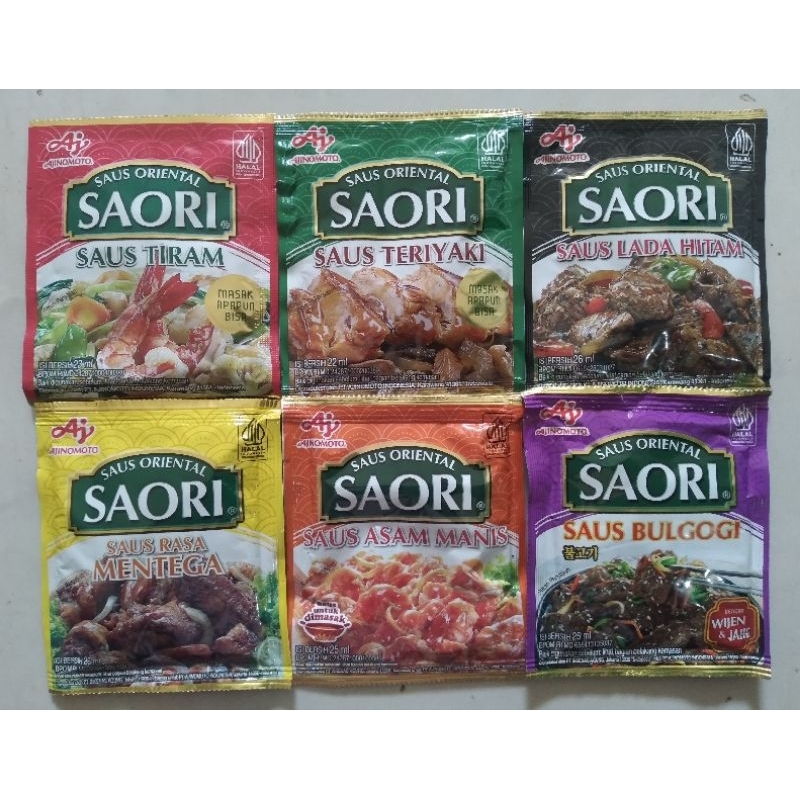 kemasan ekonomis berbagai macam saus saori sachet. Saori saus tiram, saus teriyaki, saus lada hitam, saus mentega, saus asam manis & saus bulgogi.