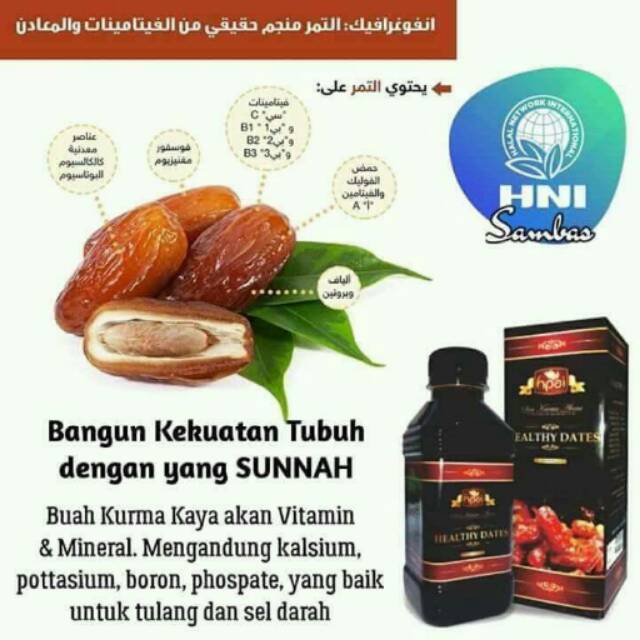 Sari Kurma HEALTHY DATES merupakan sari kurma terbaik dari Uni Emirat, bebas bahan pengawet dan bahan-bahan yang dimodifikasi secara genetik, kaya akan serat, kalium, dan antioksidan.