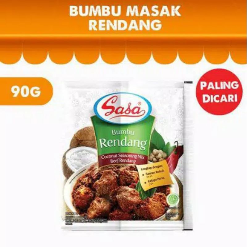 Sasa bumbu rendang adalah bumbu sasa instan yg memiliki dua sisi kemasan di sisi pertama yg kecil yaitu bumbu dan disisi yg gede yaitu santan,berat dari bumbu ini 90g untuk 1/2kg daging. Dan bumbu ini bisa dipakai bukan cuman hanya daging saja tetapi bisa untuk ayam,ataupun telur rasa rendang