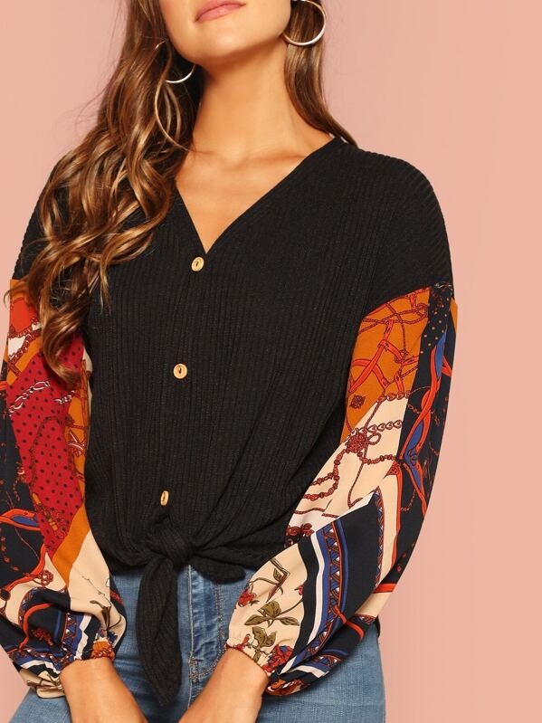 Scarf Print Button & Knot Front Ribbed Top, Black