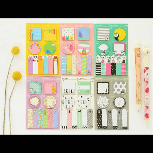 Satu set post-it / sticky notes yang berisi beberapa bentuk dan ukuran, dihiasi ilustrasi kartun yang lucu. Cocok untuk anak-anak, remaja dan orang dewasa.