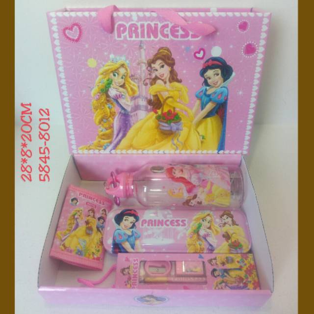 School set dilengkapi dengan botol minum, dompet, kotak pensil dan alat-alat tulis dengan karakter-karakter yang menarik