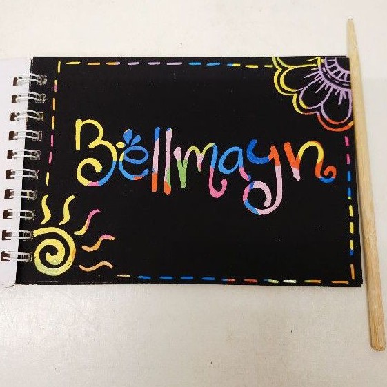 kalo anakku bilang ini buku magic... karena awalnya cuma kertas hitam pekat, tapi cuma pakai sumpit kayu tapi yang gambar atau tulisan yang muncul jadi warna warni hehehe