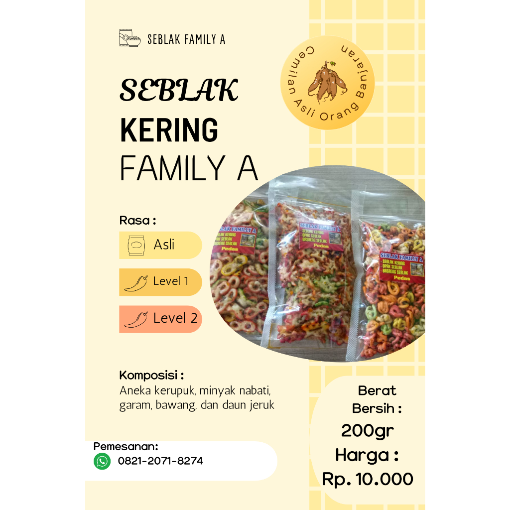 Seblak Kering d renyah dengan bumbu cabai asli dan rempah Indonesia , enak untuk ngemil bisa juga jadi toping makan nasi atau makan bakso dll , Seblak Kering Family A bisa menemani cemilan harian dirumah , happy shopping, selamat menikmati :)