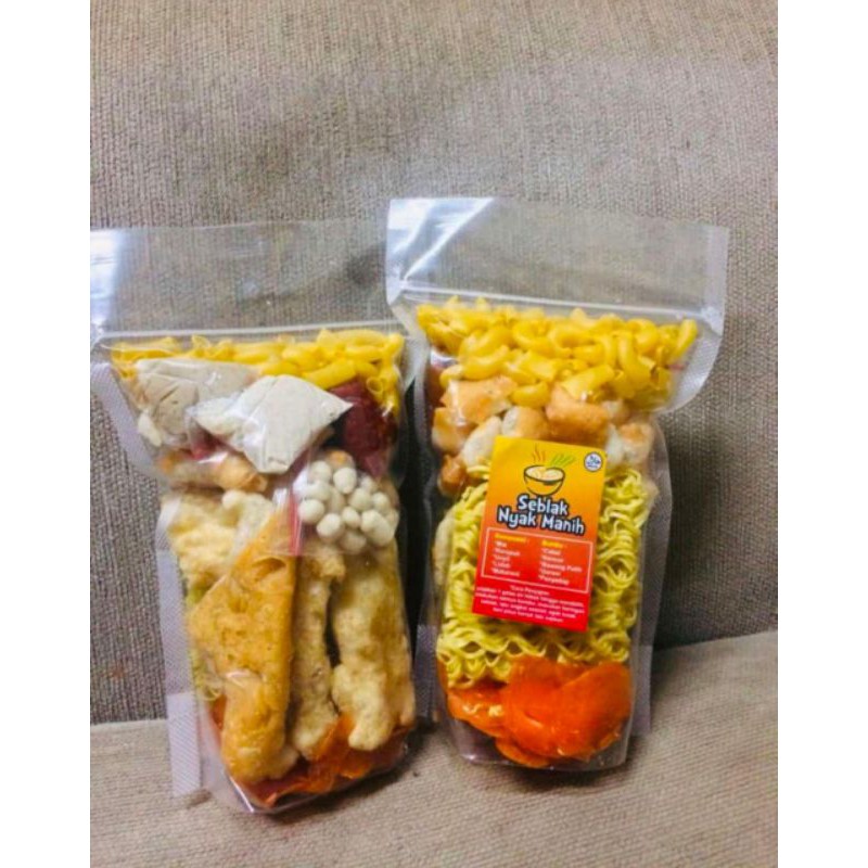 Seblak instant lengkap dengan bumbu dan bermacam topping