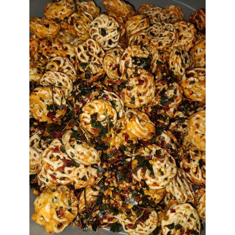 cemilan paling best seller dengan rasa pedas gurih daun jeruk,renyah & kriuk, cocok untuk cemilan,teman nasi,baso,mie dll.