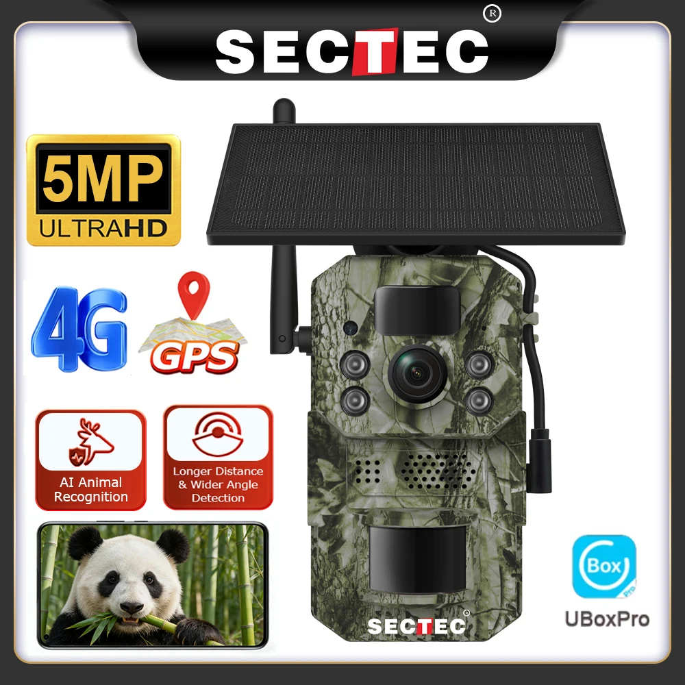 Sectec 5MP 4G Solar Hunting Camera GPS Positioning PIR Animal Identification Tracking Color Night Vision IP66 Waterproof