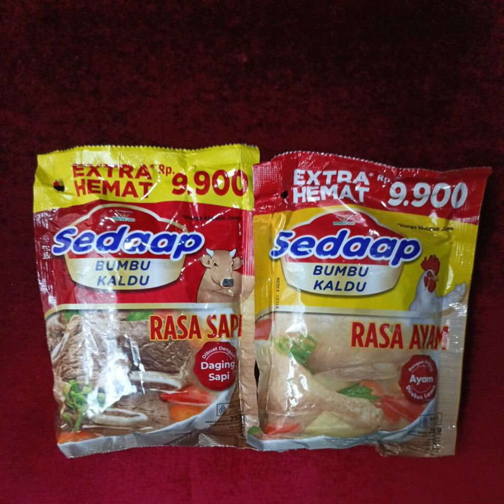 Bumbu Kaldu Sedaap Rasa Ayam dan sapi dibuat dari daging ayam asli yang direbus lama, dan Rasa Sapi dibuat dari daging sapi yang membuat gurih kaldunya pas dan wangi. Semua dipadukan dengan rempah-rempah yang menyeimbangkan rasa komponen tiap masakan, yang membuat rasa masakan anda menjadi lebih lezat dan nikmat.
