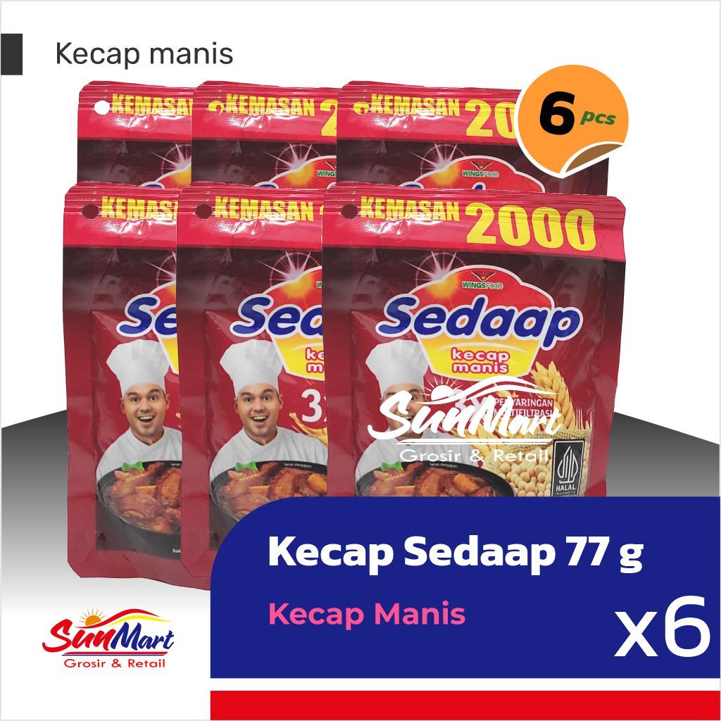 Kecap manis sedaap paket ekonomis isi 6pcsx77g meresap dengan baik ke masakan, di produksi dengan 3x penyaringan multifiltrasi.