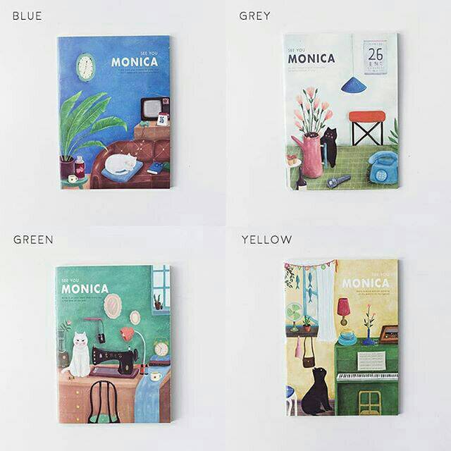 Buku tulis See You Monica menghadirkan tema kucing yang sedang bersantai di rumah. Kombinasi warna-warni pastel dan interior rumah klasik menyejukkan hati siapapun yang melihatnya.