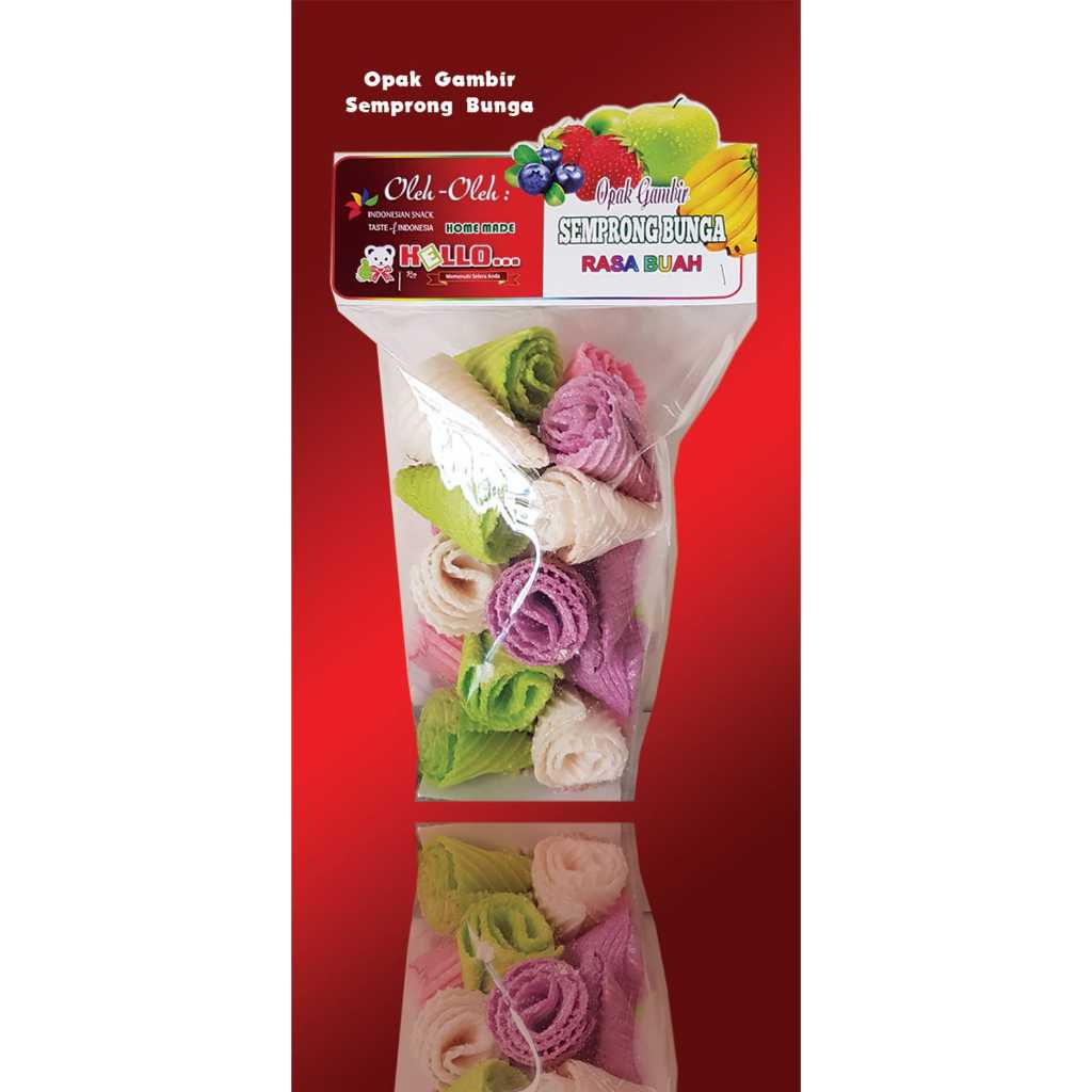 Semprong berbentuk bunga yang unik serta berwarna-warni bercitarasa buah. Cocok untuk hadiah untuk keluarga dan dijadikan sajian untuk tamu yang menarik. dengan rasa buah yang segar dapat membuat selera anda makin meningkat.