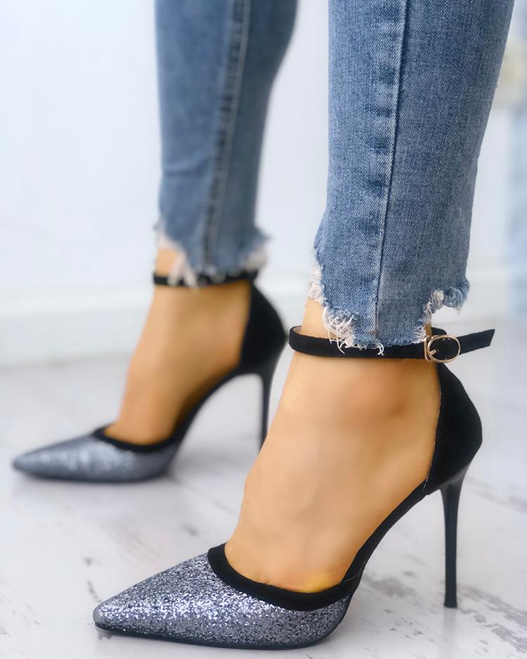 Sequins Ankle Strap Pointed Toe Heels, Gold