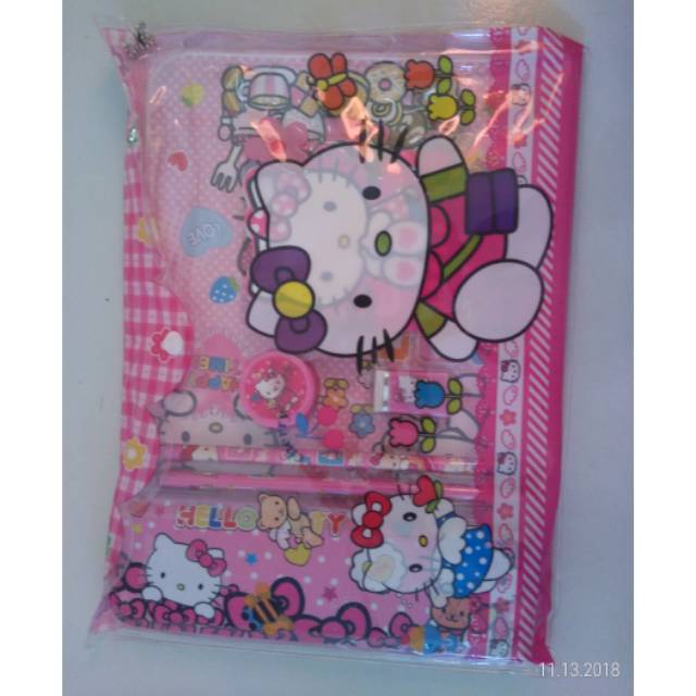 Terdiri dari notes hello kitty,penghpus pensil, rautan pensil, pensil 2 pc, tempat pensil dan colouring book,penggaris pendek 1 buah.