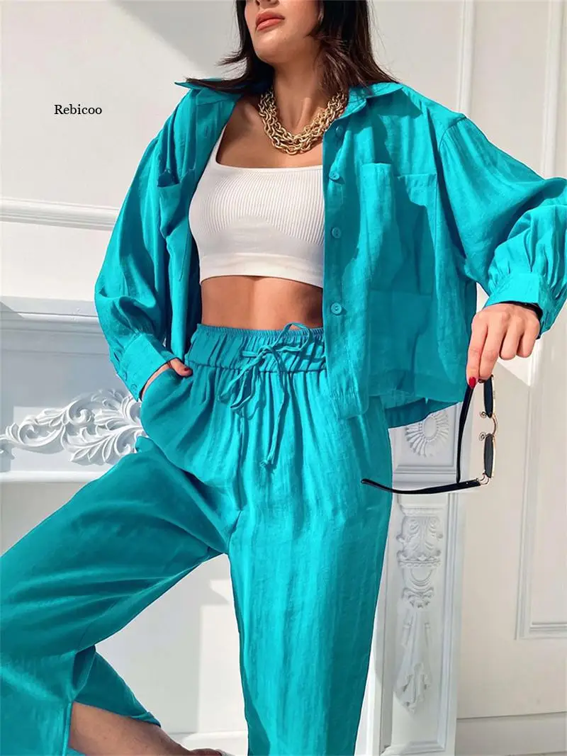 Женский комплект из двух предметов, элегантная Свободная рубашка с высокой талией и брюки с разрезом, однотонный комплект из двух предметов, лето 2022