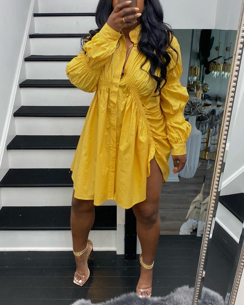 Shirred Ruched Design Button Front Shirt Dress, Yellow