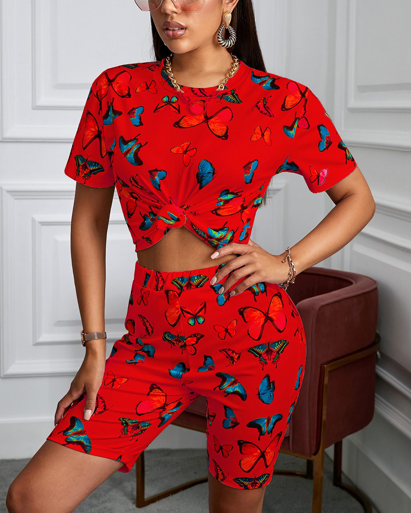 Short Sleeve Butterfly Printed Top & Short Sets, Red