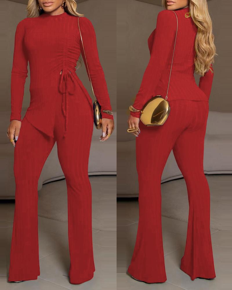 Side Drawstring Slit Ribbed Top & Flared Pants Set, Red