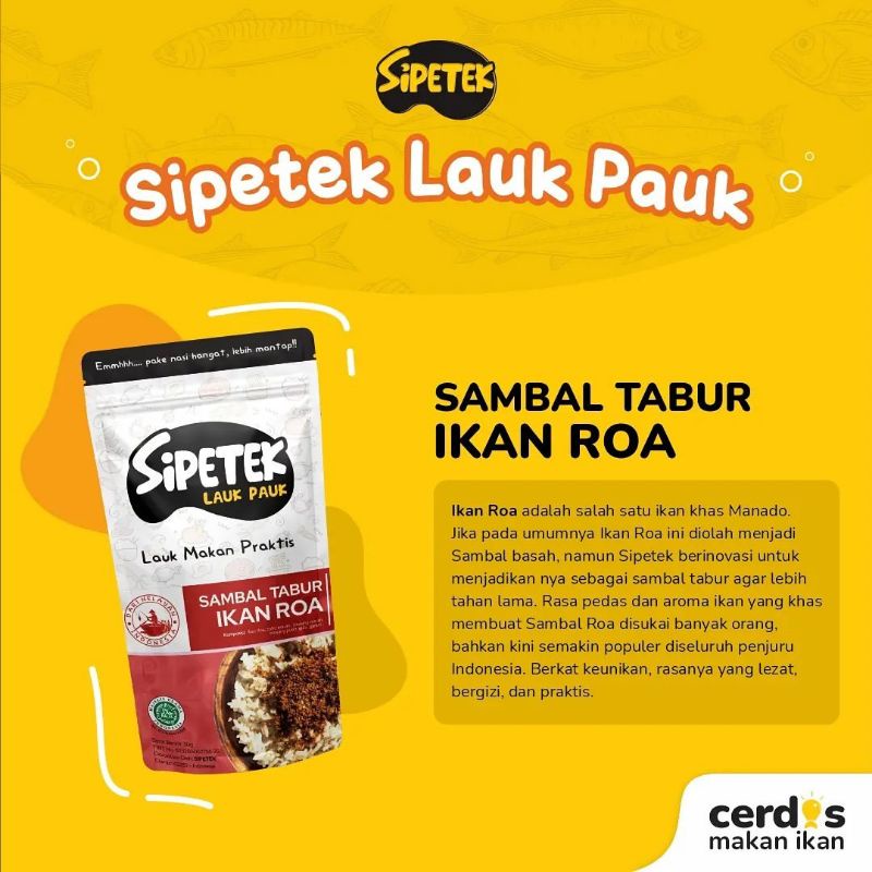 Crispy Ikan Sipetek merupakan produk olahan ikan berukuran mungil yang digoreng crispy kemudian dikemas dalam kemasan menarik. Sipetek bisa dimakan sebagai camilan maupun lauk makan. Selai praktis tinggal makan, keunggulan lain dari sipetek adalah ikan mungil yang memiliki kandungan kalsium dan protein yang sangat tinggi.