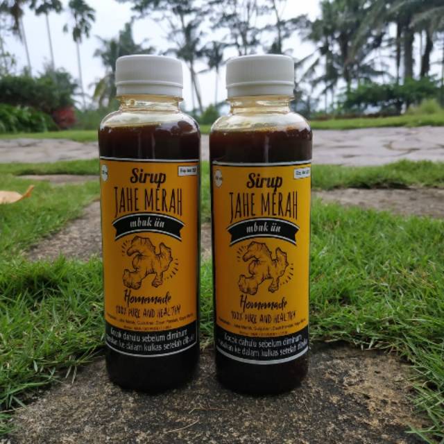 sirup jahe merah murni dengan campuran rempah-rempah seperti : Akar alang alang, kayu manis, daun pandan & sereh