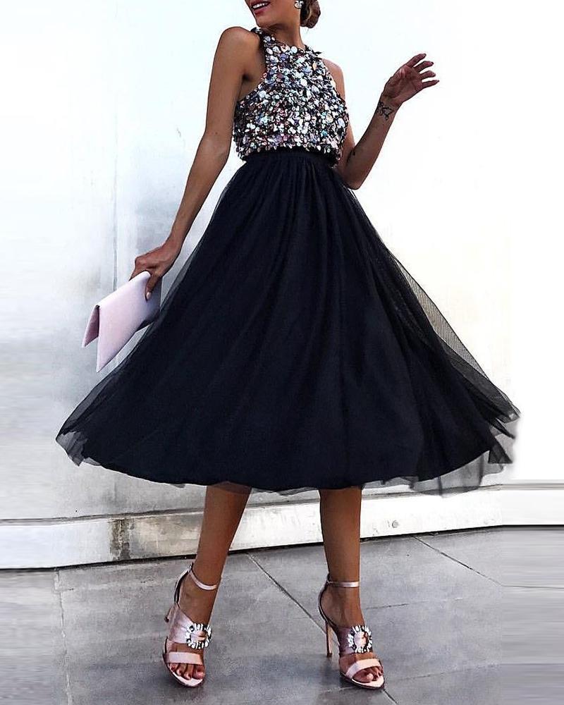 Sleeveless Sequins Colorblock Mesh Insert Ruffles Ruched Dress, Black