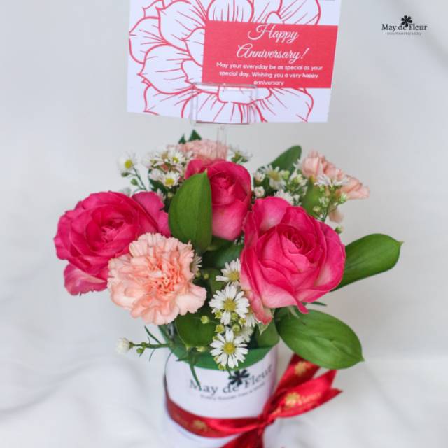 Box ukuran kecil yang berisi bunga mawar dan anyelir (carnation) dengan gaya rangkaian korea sehingga terlihat cerah dan elegan. Simple dan akan dibungkus dengan paperpab bening
