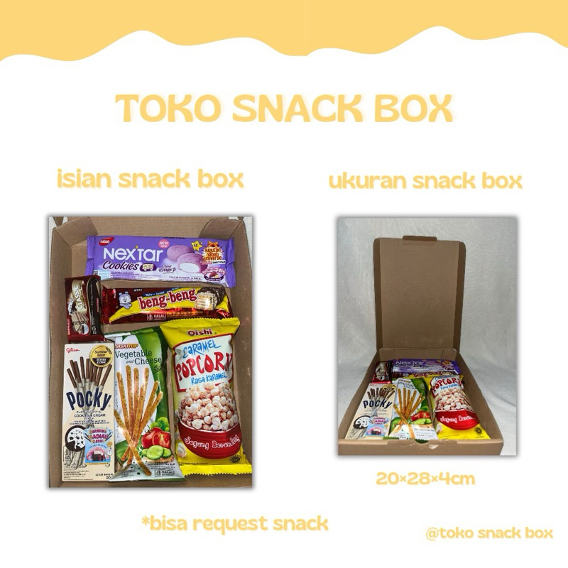 Snackbox adalah mini gift yang cocok di berikan kepada teman/pacar/anak/saudara dll, serta dapat untuk acara formal dan non formal.