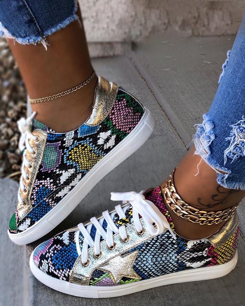 Snakeskin Star Design Lace-Up Sneakers, Multicolor