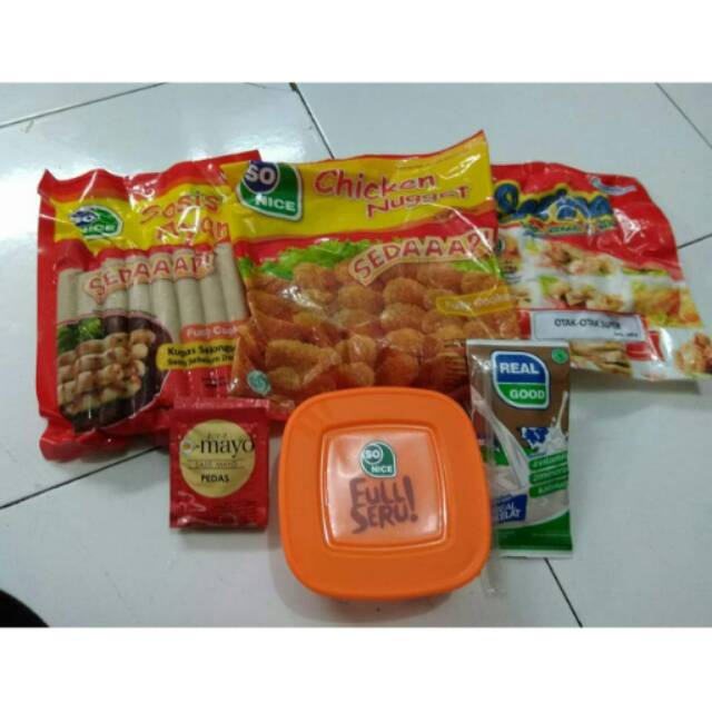 nugget 250gr, otak" 200gr, sosis 375gr, susu real good, mayo 5pcs, free lunch box. 65rb/paket