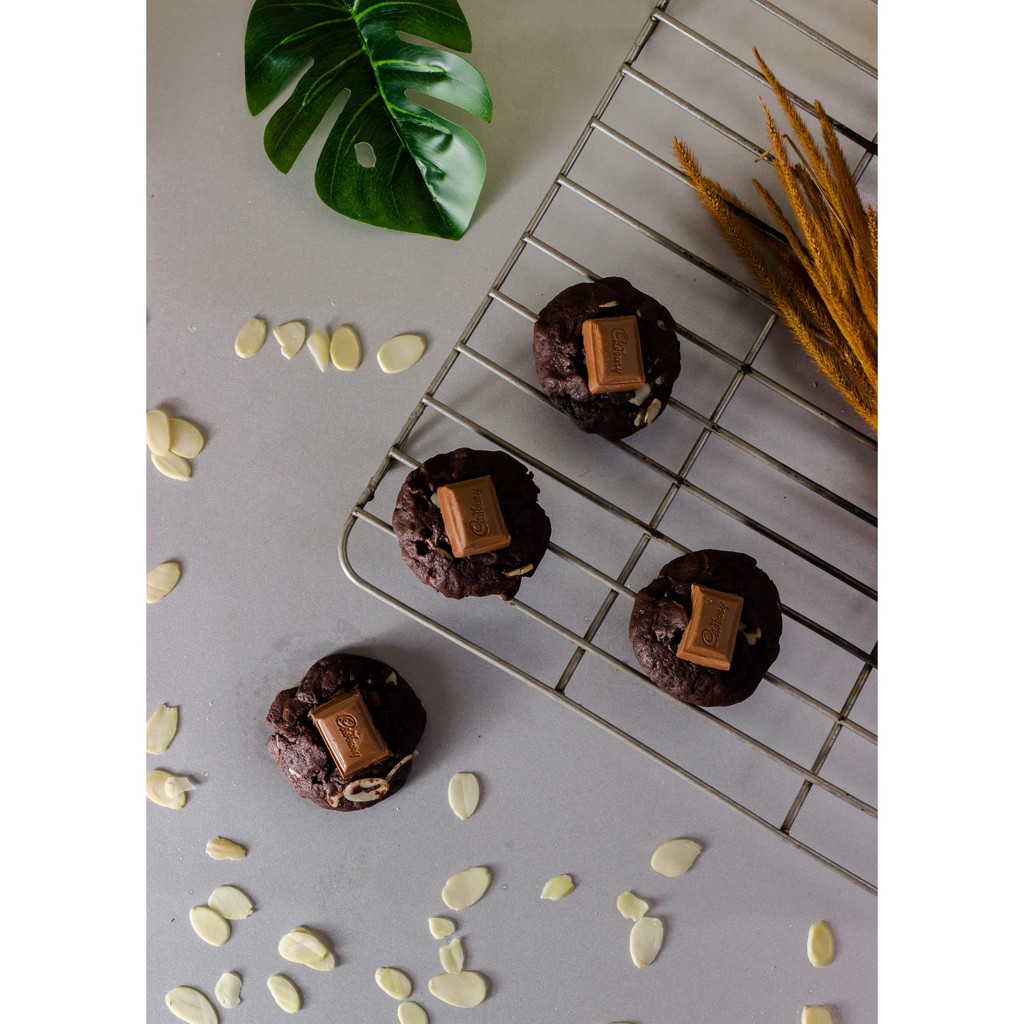 Soft cookies yang dicampur dengan almond dan berisi nutella dan topping cadburry.
