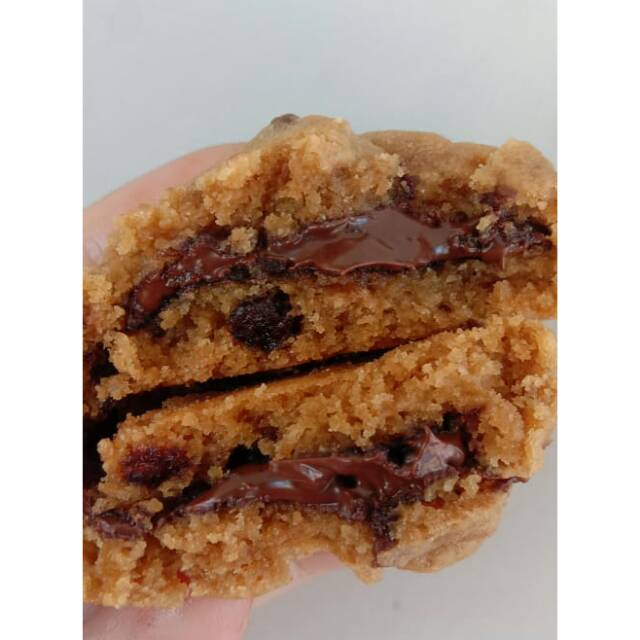 Cookies yg garing renyah diluar, lembuuttt didalem.. Dan ada coklat yg meleleh didalam cookiesnya dan dg tambahan choco chip juga didalamnya..