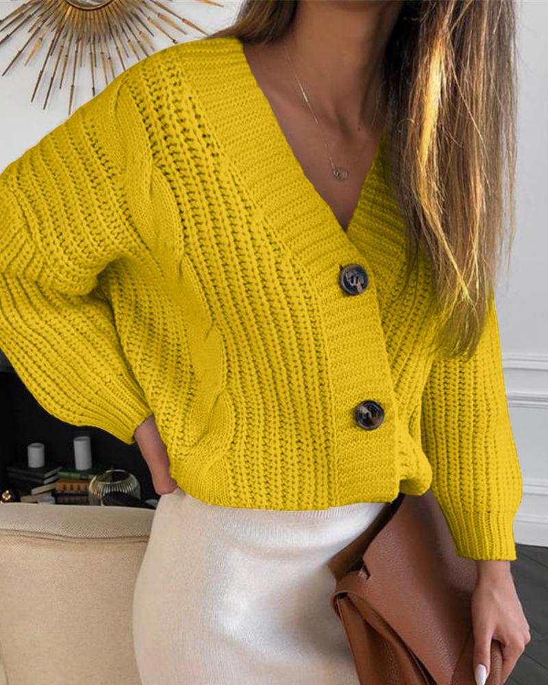 Solid Button Design Lantern Sleeve Knit Sweater, Yellow