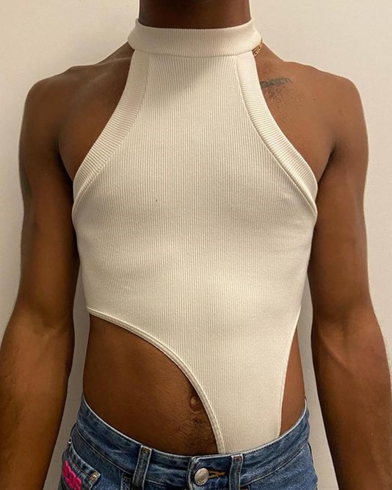 Solid Color Halter Sleeveless Ribbed Irregular Tank Top, White