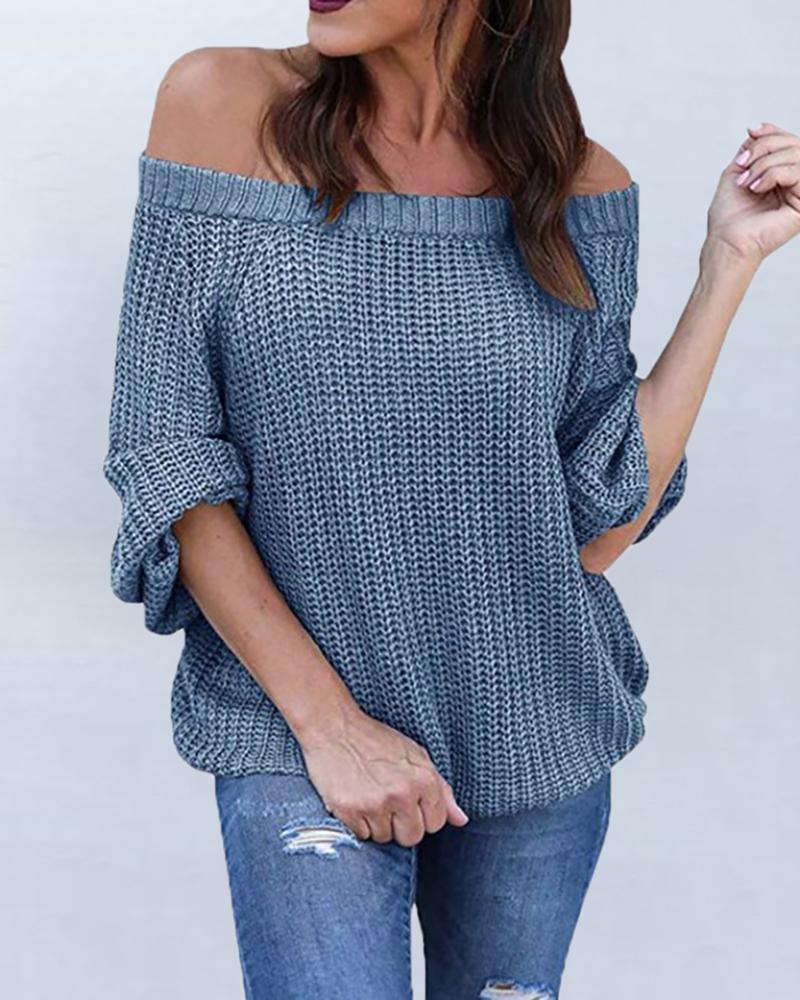 Solid Off Shoulder Long Sleeve Knitting Sweater, Blue