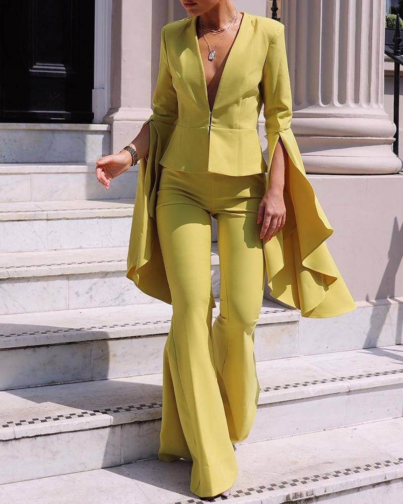 Solid Plunge Ruffles Blazer & Bell-bottomed Pants Sets, Yellow