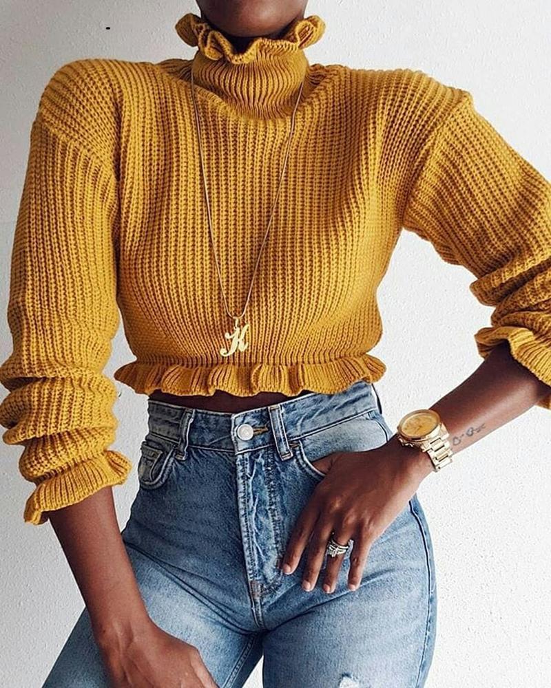Solid Ruffles Design Long Sleeve Sweater, Yellow
