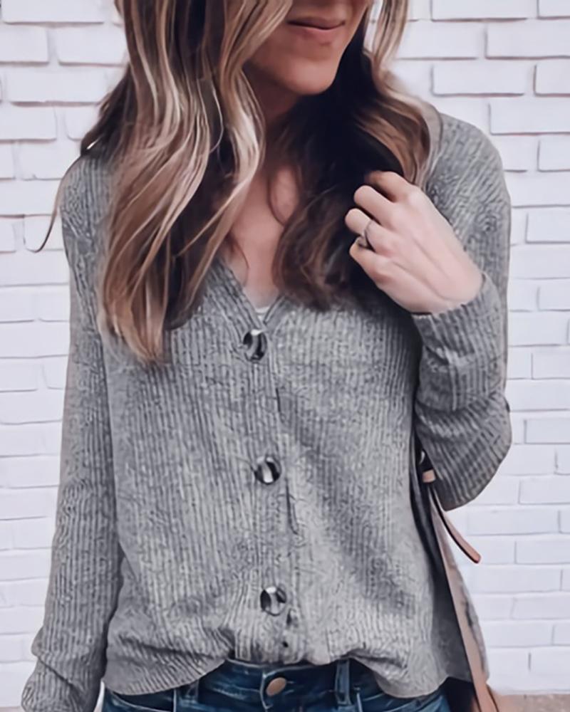 Solid V Neck Ribbed Buttoned Cardigan, Gray
