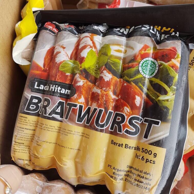 Sosis Bratwurst daging sapi rasa lada hitam. Per pack isi 6, panjang kurang lebih 22cm