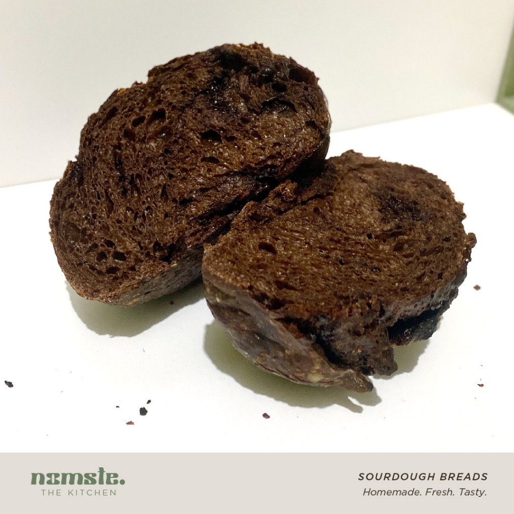 Roti Country Sourdough rasa cokelat dengan potongan melted chocolate. Rasa sedikit manis dan sedikit asam dari proses fermentasi alami selama 24 jam. Tekstur roti chewy, lembut, dengan pinggiran crust yang garing. Roti ini less sugar cocok untuk yang sedang cut gula namun ingin sedikit rasa manis.