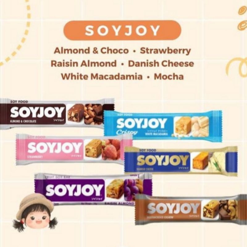 SOYJOY adalah makanan sehat yang terbuat dari kedelai yang tersedia dalam 5 variant yaitu : Almond Chocolate, Raisin Almond, Banana, Strawberry, dan SOYJOY CRISPY Vanilla. SOYJOY yang terbuat dari kedelai utuh diproses secara higienis memberikan rasa serta manfaat yang dibutuhkan oleh tubuh.