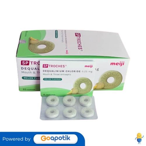 Deskripsi: SP troches digunakan untuk meredakan nyeri tenggorokan, infeksi rongga mulut dan faring, setelah ekstraksi gigi untuk mencegah infeksi membran mukosa mulut dan mencegah batuk dan pilek, terutama untuk perokok dengan rasa melon. | Komposisi: Tiap tablet mengandung dequalinium chloride 0,25 mg | Dosis: 1 lozenges (tablet hisap) di atas lidah, ulangi tiap 3-4 jam. Maksimal 8 tablet per hari | Indikasi: Digunakan untuk meredakan nyeri tenggorokan, infeksi rongga mulut dan faring, setelah ekstraksi gigi untuk mencegah infeksi membran mukosa mulut dan mencegah batuk dan pilek, terutama untuk perokok | Perhatian Khusus: | Kemasan: Box 20 strip x 6 tablet | NIE: DBL8515300712A1